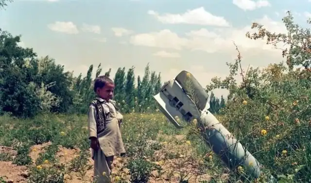 Афганский мальчик, наблюдающий за неразорвавшейся бомбой, сброшенной советскими войсками во время советско-афганской войны, июль 1989 года.