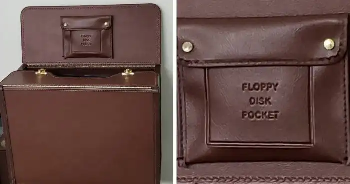 13. Старый кожаный чемодан со специальным кармашком для дискеты