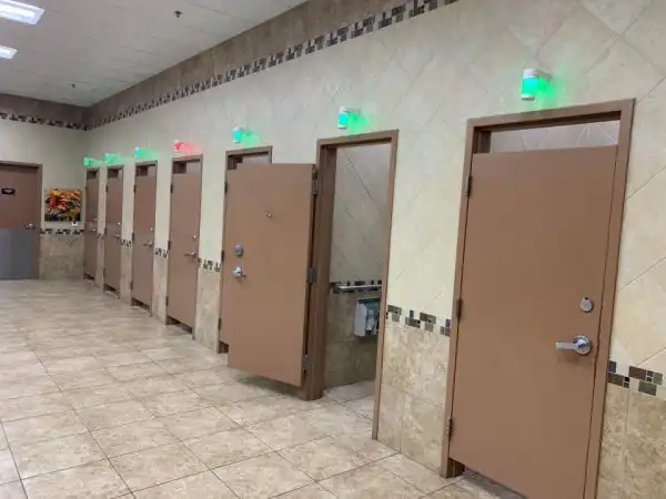 Над кабинками установлены индикаторы света, чтобы посетители могли понять, какой туалет свободен