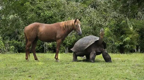 Размер Галапагосской гигантской черепахи по сравнению с размером лошади