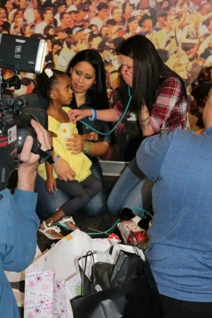 Мать пожертвовала сердце своего умершего сына 4-летней девочке. На фото она впервые слушает сердцебиение