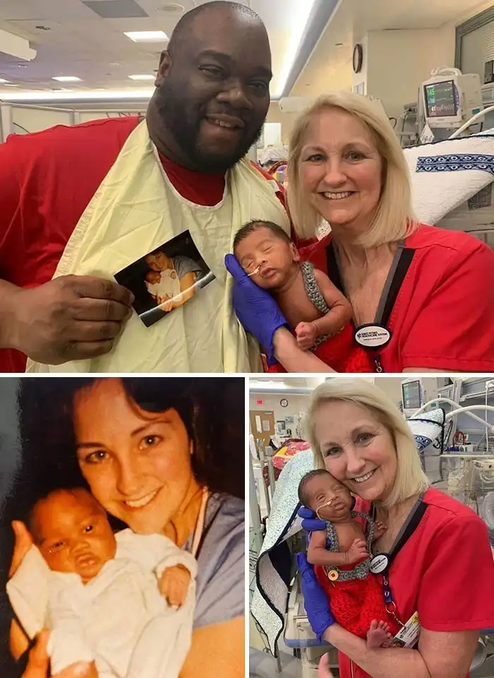 Эта медсестра из роддома ухаживала за этим мужчиной, когда он родился, а теперь - за его сыном