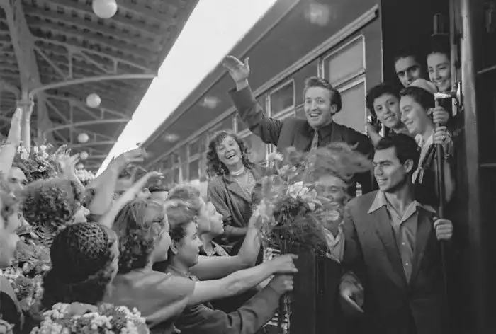 32. Молодежь в электричке с дарами подмосковных лесов. СССР. 1950-е. Фото Михаила Грачёва