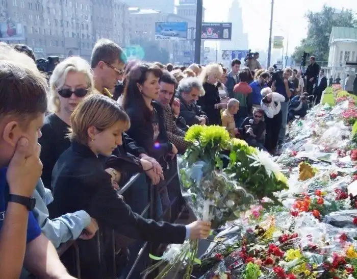 15. Россияне скорбят по погибшим в теракте 9/11 у посольства США в Москве, 13 сентября 2001 год