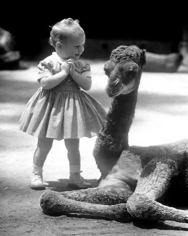 24. Девочка восхищается верблюжонком в зоопарке Сан–Диего, 1959 год, США