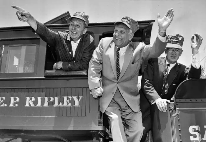 38. Уолт Дисней едет по железной дороге Disneyland в день открытия, 17 июля 1955 года