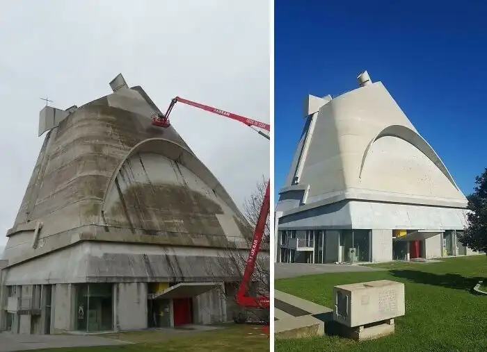 21. Церковь Сен-Пьер в Фирмини, Франция, спроектированная архитектором Ле Корбюзье, впервые подверглась мойке под давлением