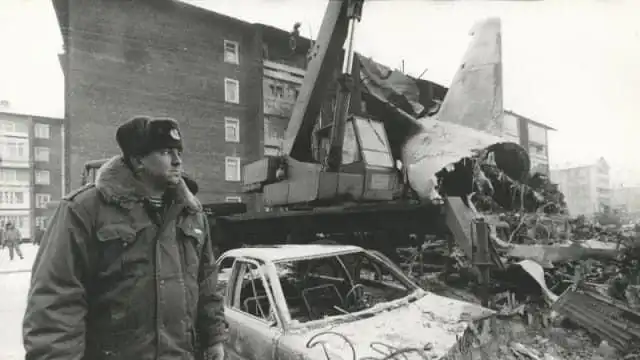 Спасательная операция на месте крушения самолета Ан-124 "Руслан", упавшего на жилой дом во Втором Иркутске, задев детский дом. Погибли 76 человек, из них 4 ребенка. 1997 год.