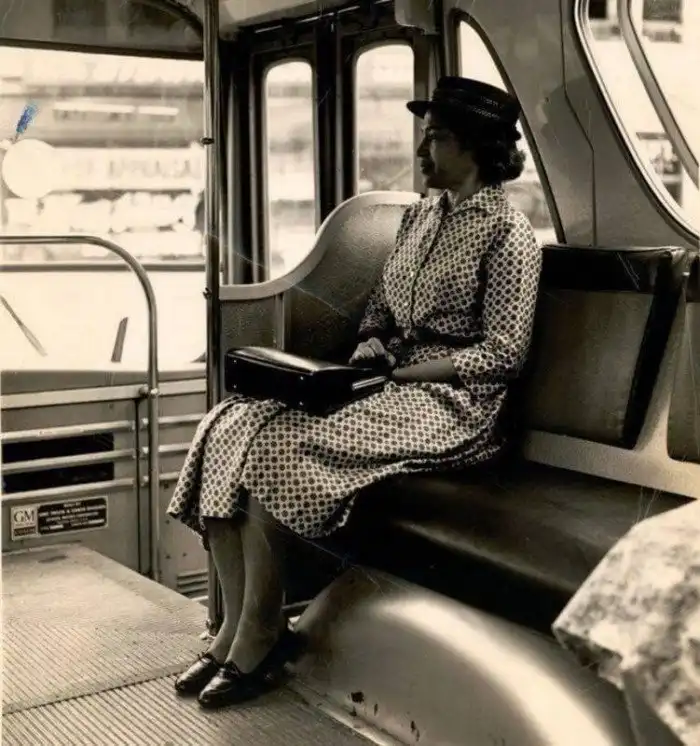 10. Роза Паркс сидит в передней части автобуса после отмены расовой сегрегации в транспорте, примерно 1965 год