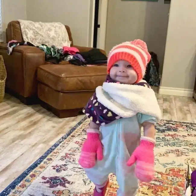 "Шестилетняя дочь мое подруги собрала свою младшую сестру на зимнюю прогулку. Малышке явно понравился костюм!"