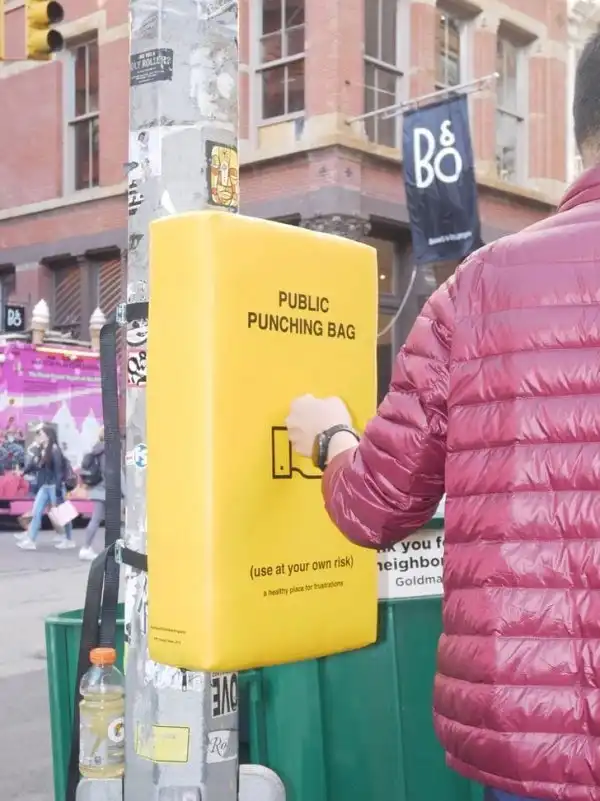 В Нью-Йорке знают, как помочь жителям мегаполиса. На улицах установили боксёрские груши — их можно бить, чтобы выплеснуть все отрицательные эмоции
