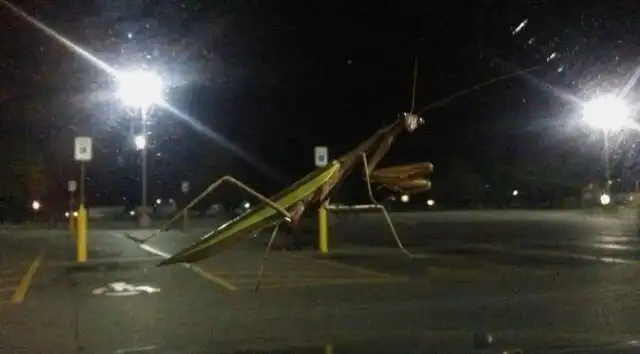 Богомол выглядит как настоящий гигант, но он всего лишь на стекле машины