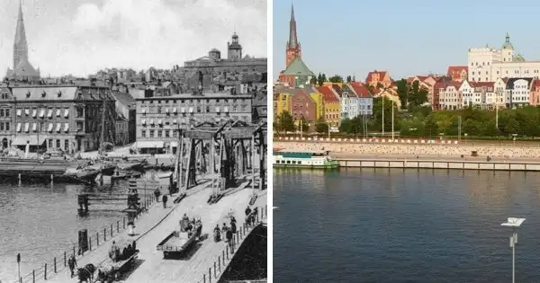 Река Одра в городе Щецин, Польша, и не существующий ныне деревянный мост — 1900 год и сейчас