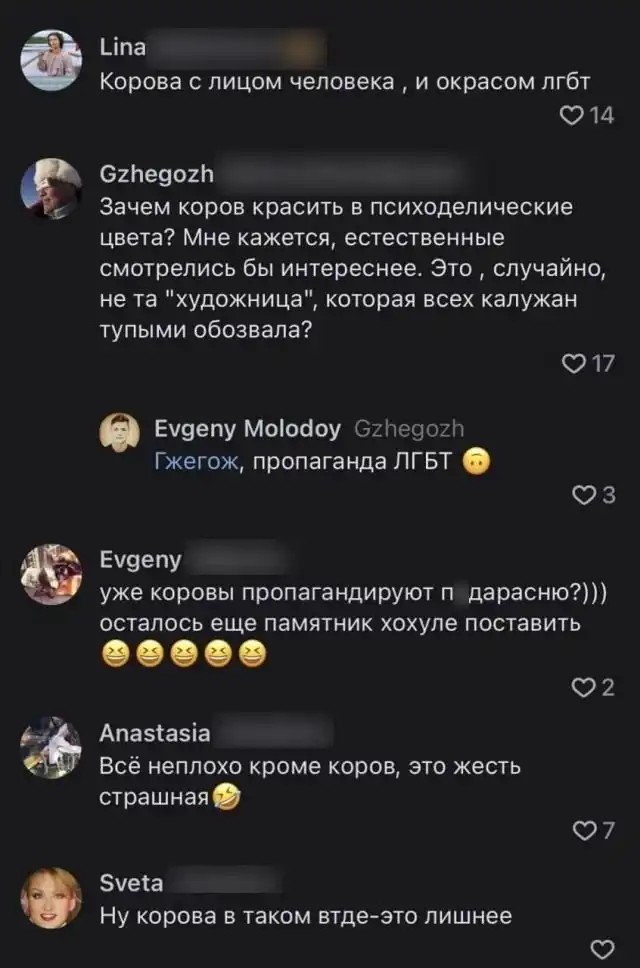 В России три беды: дураки, дороги и вездесущее ЛГБТ. В Калуге возле местного мясокомбината статую выкрасили в яркие цвета... радужные цвета. Конечно же, у хранителей традиционных ценностей сработала тревога и был объявлен общий сбор в соцсетях, где они потребовали вернуть коровам оптимистичный серый цвет. Страшные изваяния испугали народ не только своим окрасом, но и "человеческими лицами". В целом... все "плохо", но управляющий мясокомбината заявил, что это просто такой художественный стиль.