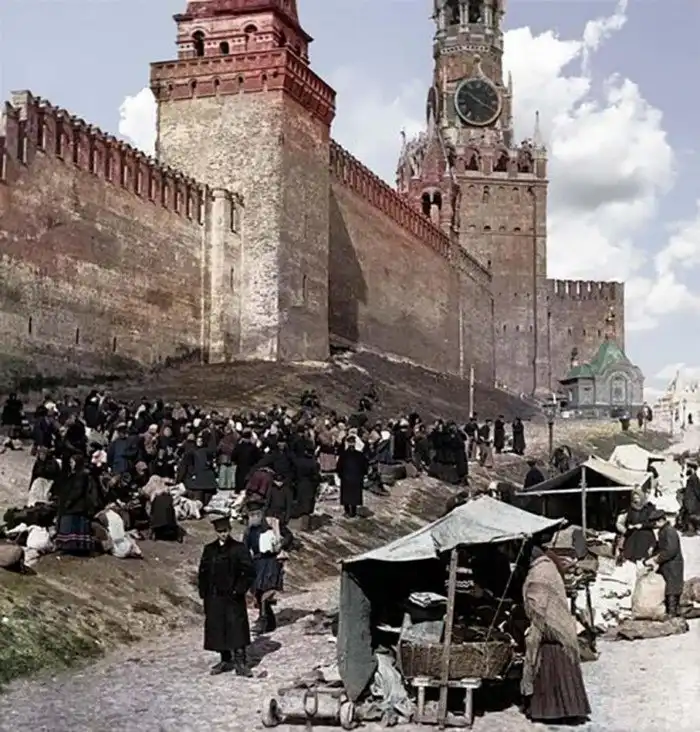8. На фото — раскрашенный снимок площади Васильевский Спуск, до 1930-х