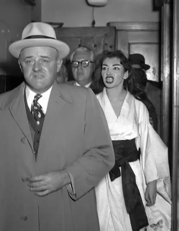 20. Оперная дива Мария Каллас шипит на федерального маршала Стэнли Прингла, который после концерта, под видом поклонника, вручил ей цветы и повестку в суд. Чикаго, США, 1955 год