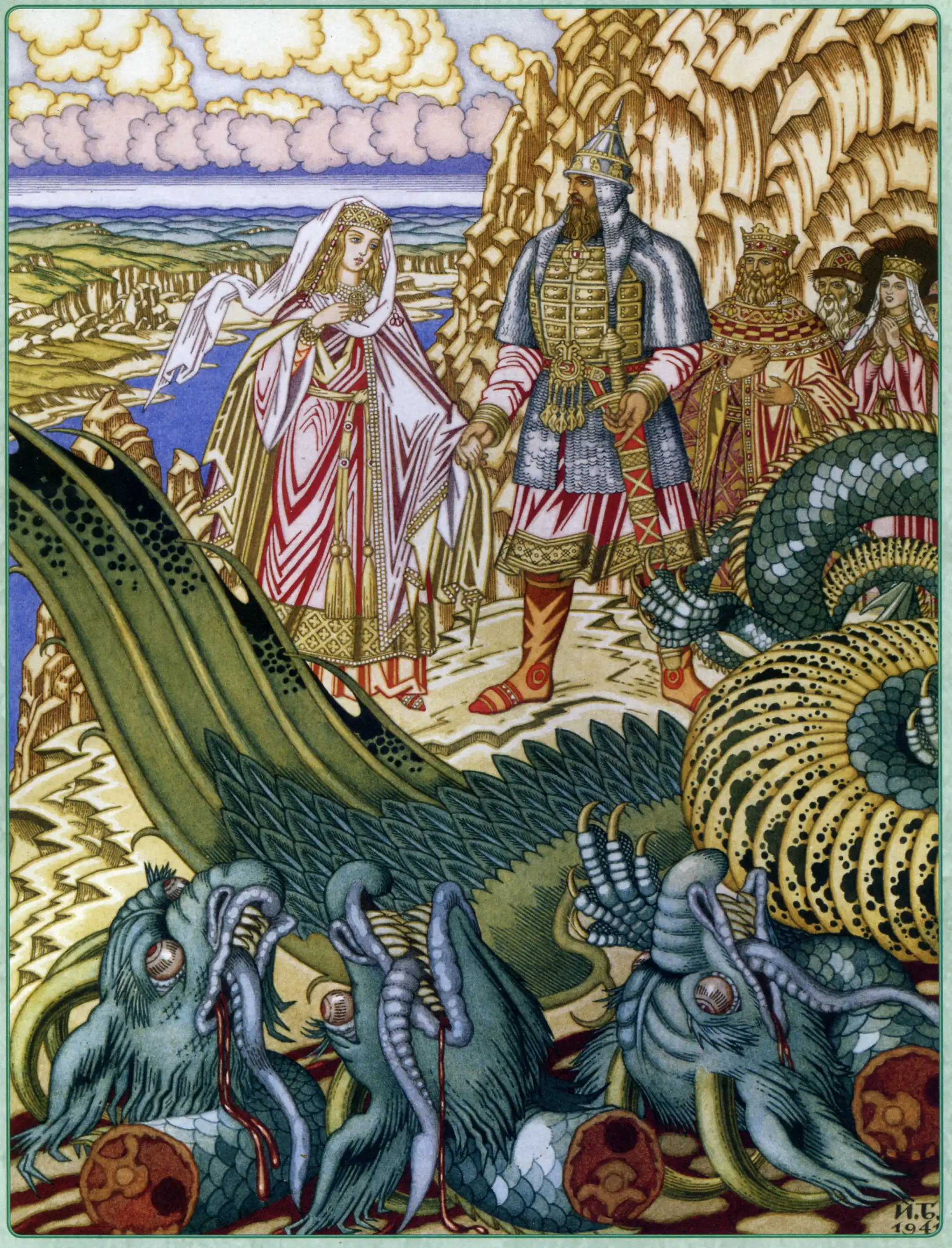Добрыня Никитич освобождает от Змея Горыныча Забаву Путятичну. Эскиз иллюстрации к сборнику былин для книги Н.В. Водовозова Слово о стольном Киеве и о русских богатырях. 1941