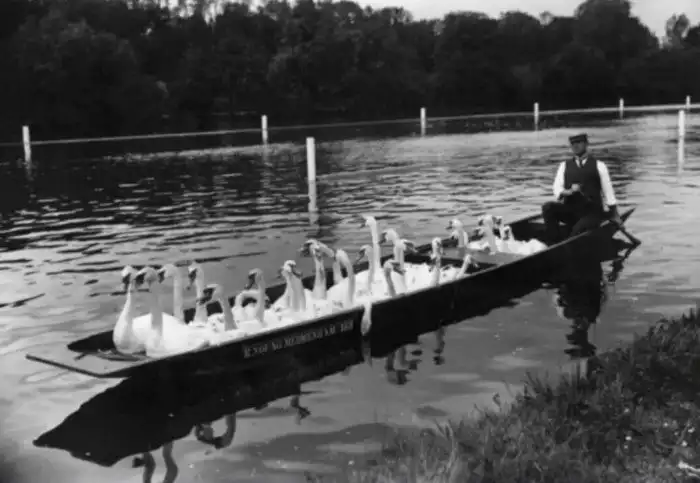 19. Рабочий убирает всех лебедей перед началом соревнований по гребле. Англия, 1900 год