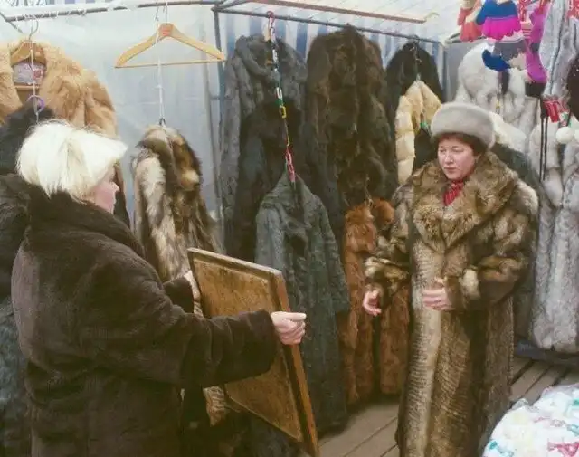 4. Женщина выбирает себе на рынке шубу, Россия, 1990-е годы
