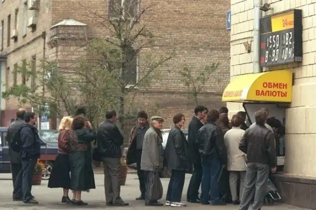 33. Люди стоят в очереди в обменник, Москва, 1998 год