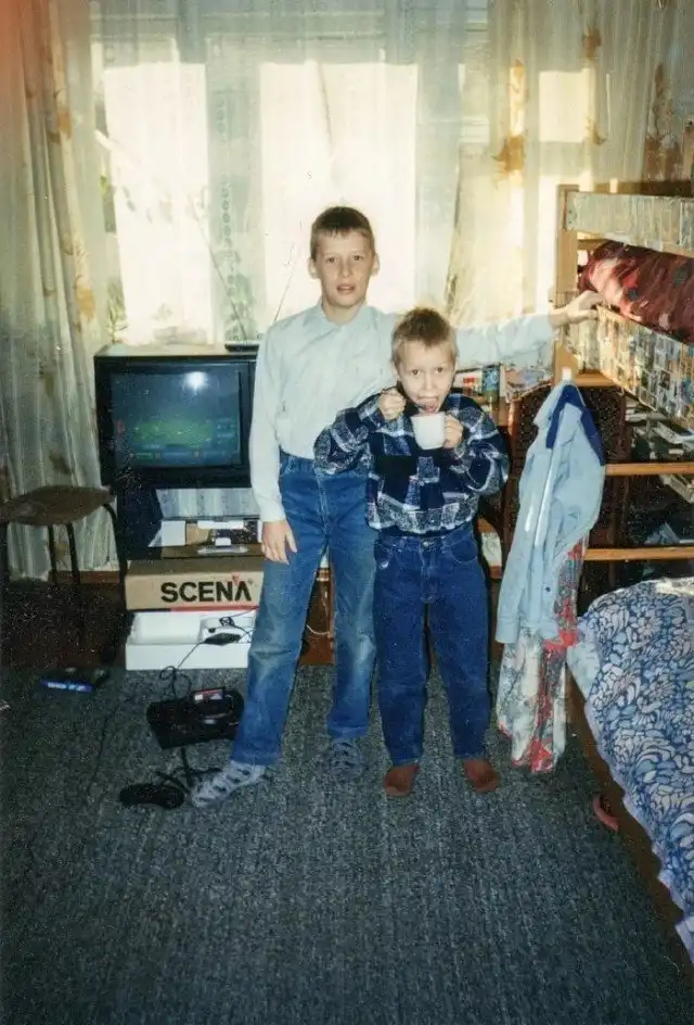 42. Парни сделали перерыв во время игры на приставке « Sega» На экране игра Jungle Strike, слева лежит картридж RoboCop versus The Terminator . Владивосток, 1996 год