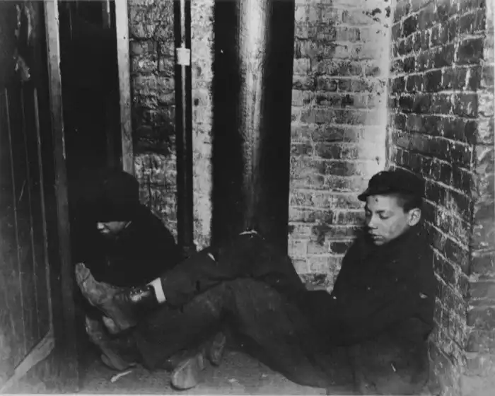 Мальчишки-газетчики в 2 часа ночи спят в типографии The Sun в ожидании утреннего выпуска. Нью-Йорк, 1892 год