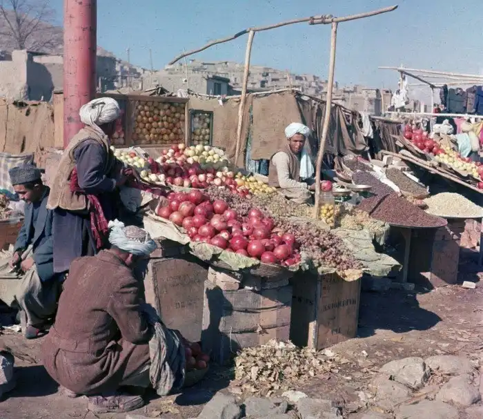 Торговцы продают орехи и фрукты на рынке в Кабуле, ноябрь 1961 года.