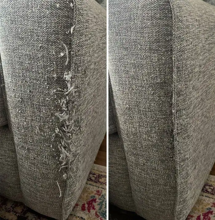 Устранение кошачьих царапок на диване с помощью иглы для валяния: до и после