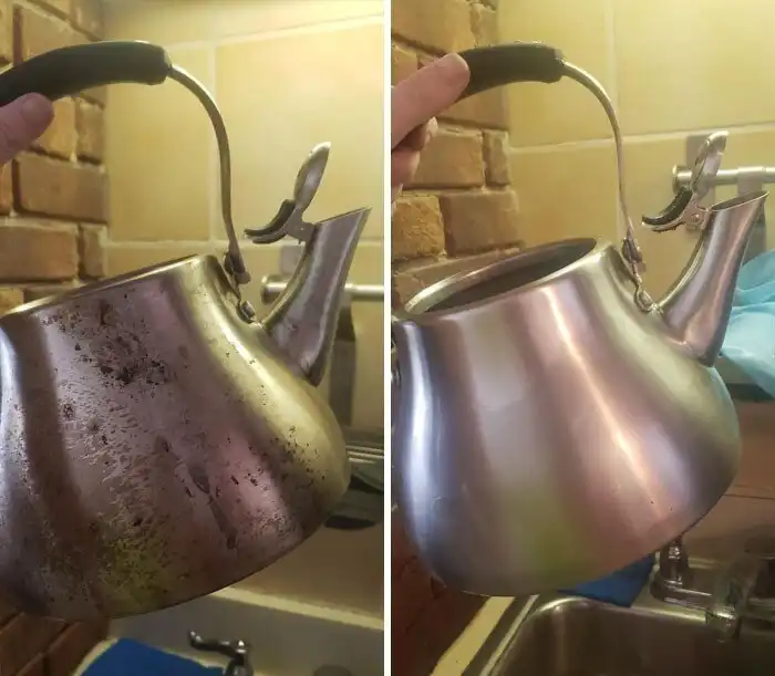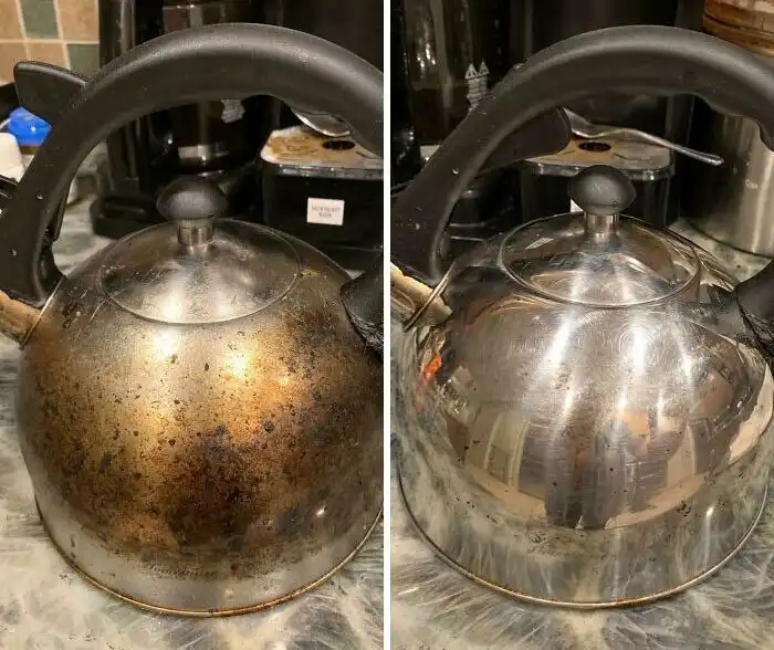 "Была в гостях у сестры и пожалела ее страшно забрызганный жиром и пригоревший чайник. Средство для мытья посуды и паста для чистки металлических поверхностей - и он почти как новенький!"