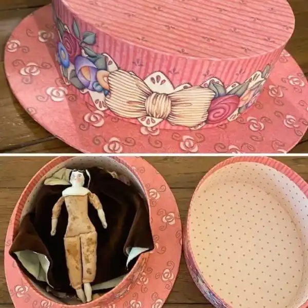 Купила эту шляпную коробку, ни о чём не подозревая. Оказалось, что у неё фальшивый верх, и внутри хранится вот эта всеми забытая красавица с нарядами.