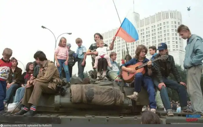10. У здания Верховного Совета на остановленном танке, 1991 год