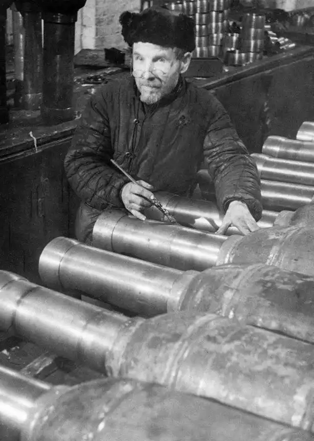 23. Ветеран завода «Большевик» Александр Александрович Смирнов, проработавший на заводе 40 лет, на производстве реактивных снарядов М-28. Декабрь 1942 — февраль 1943 гг.