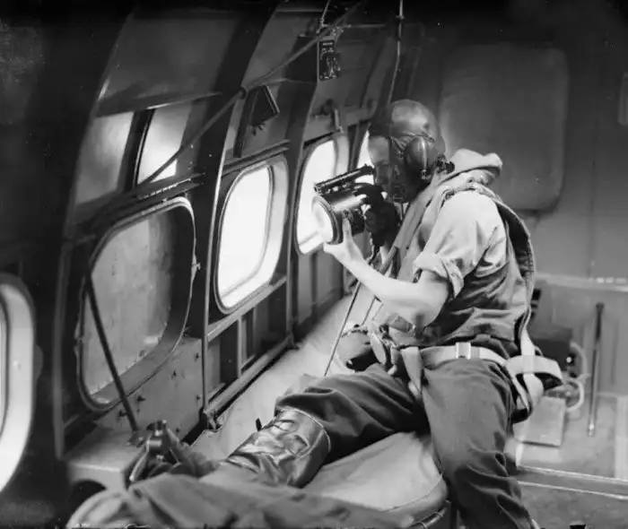 Во время Второй мировой войны, когда требовалось соблюдать радиомолчание, радисты бомбардировщиков использовали сигнальные прожекторы для связи с находящимися поблизости самолетами во время полета. Здесь, как утверждают, радист передает другому самолету, чтобы он держался в тесном строю. Прообраз лазерной связи FSO (АОЛС), ведь она тоже более скрытна?