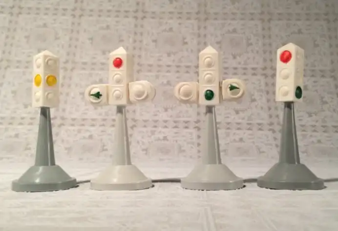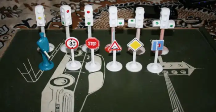 Помимо транспорта в чемоданчике имелись все виды дорожных знаков, светофоры с различной индикацией, схемы улиц и перекрестков, а также фигурки регулировщиков.