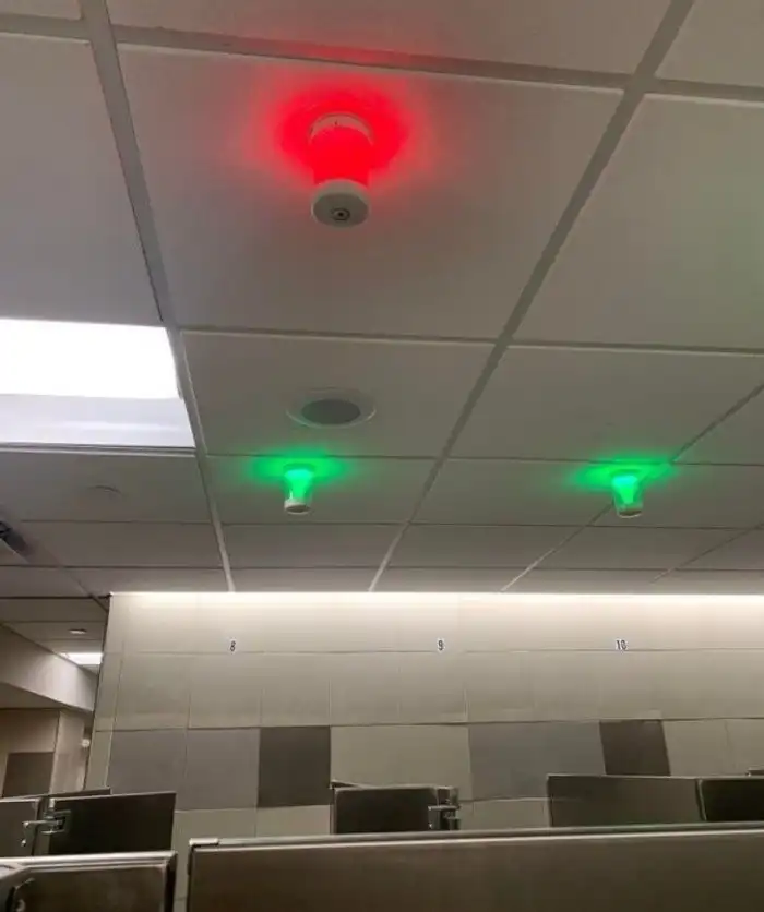 Туалет в аэропорту Далласа, США. Лампы над кабинками горят зеленым или красным, в зависимости от того, свободна ли кабинка