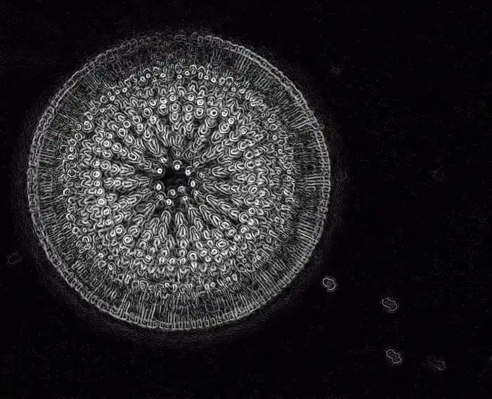 Панцирь диатомовой водоросли под микроскопом в максимальном оптическом увеличении