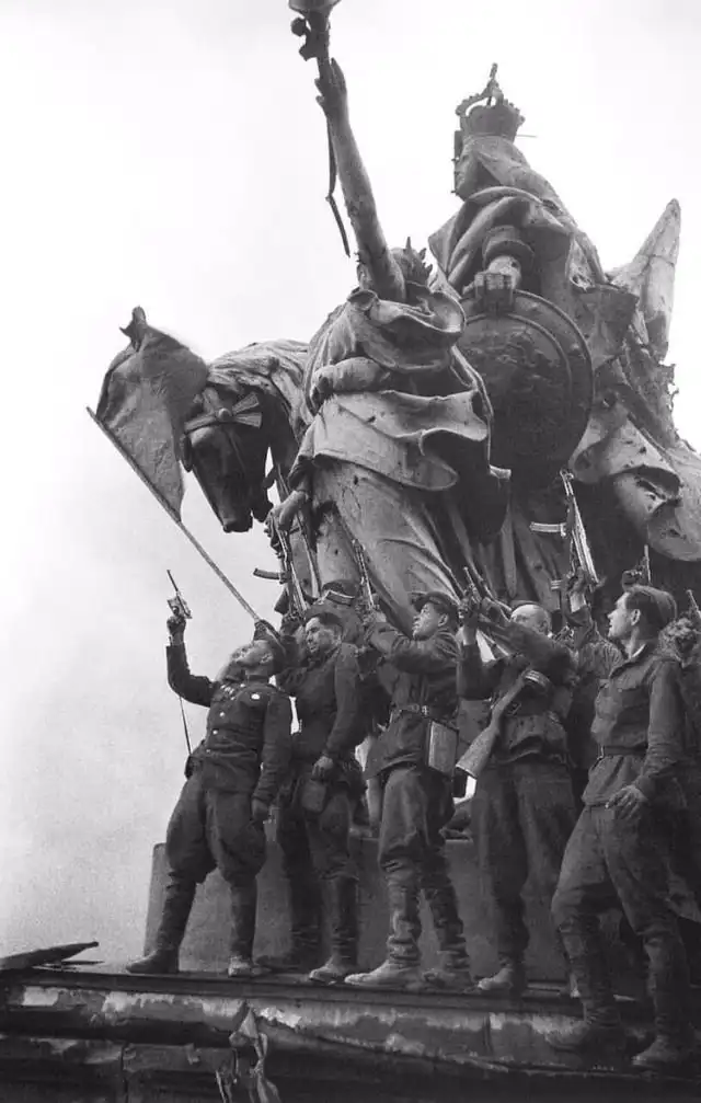 Салют в честь Победы на крыше Рейхстага. Солдаты батальона под командованием Героя Советского Союза С. Неустроева. 9 мая 1945