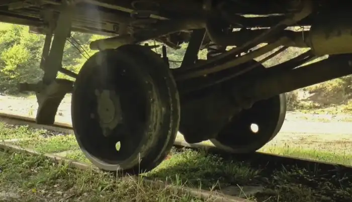 В результате весь фургон приподнимается, реборды колёс выходят из зацепления с головками рельс, и весьма немолодой мужчина довольно-таки легко может один развернуть весь фургон на месте.