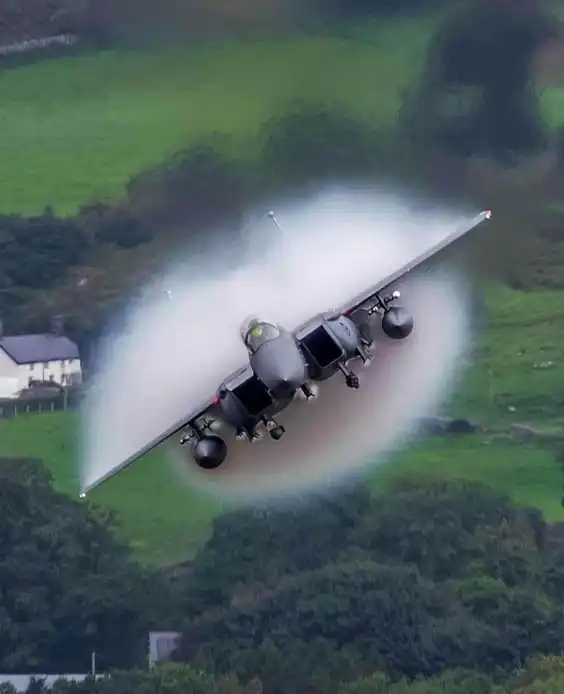 Видимый конус пара вызван скачком уплотнения, при котором возникает перепад давления и температуры окружающего самолет воздуха