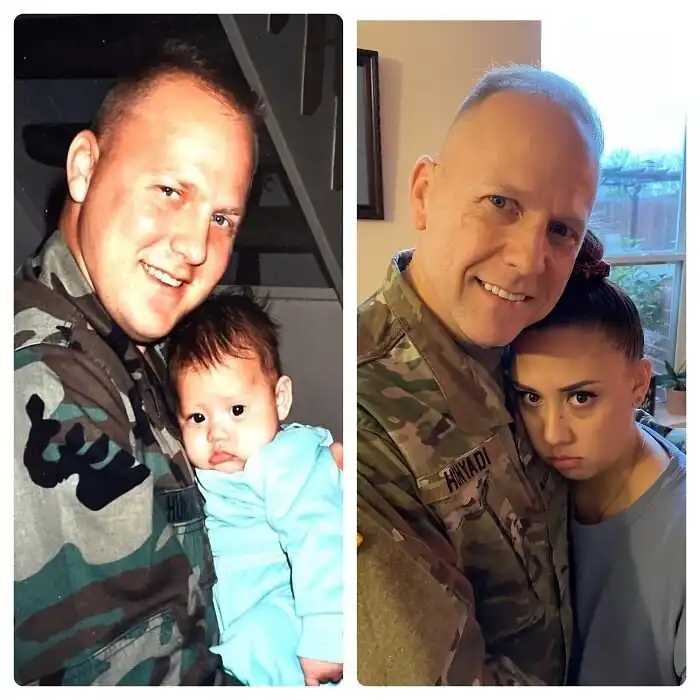 21. "27 лет между этими фотографиями нас с дочерью. Теперь она леди, а я все еще военный"