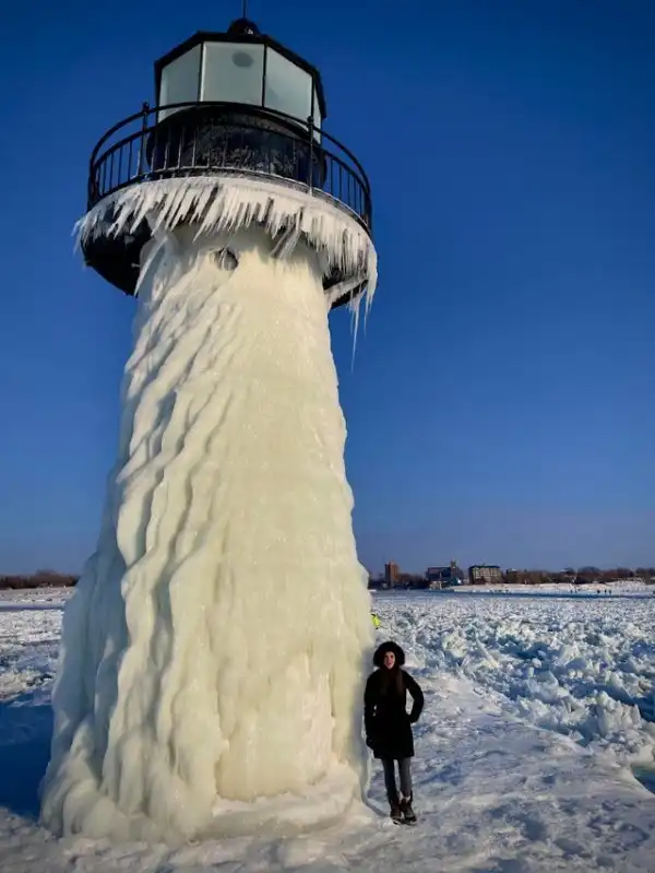 Замёрзшие волны на маяке на юго-западе Мичигана