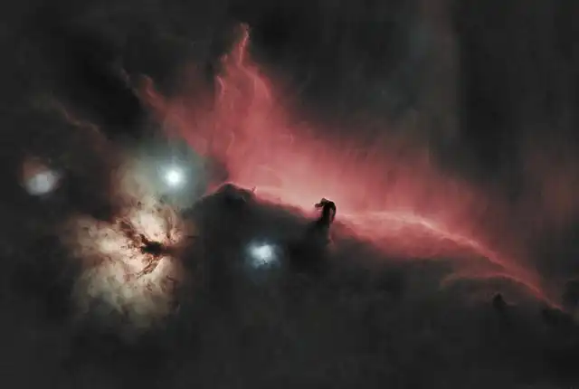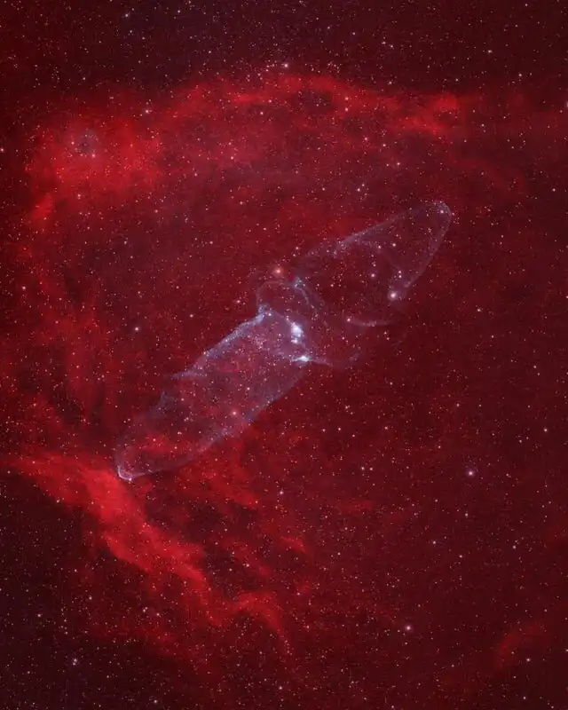 Потребовалось 17 часов, чтобы сфотографировать этот загадочный уголок нашей галактики. Тусклая туманность Кальмар находится в крыльях туманности Летучая мышь на расстоянии около 2300 световых лет от нас. Кальмар, размером с шесть полных лун на ночном небе, находится в созвездии Цефея.