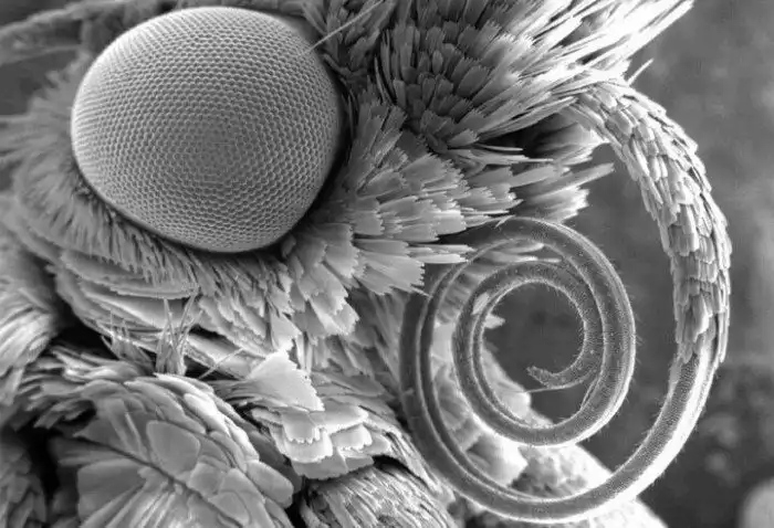 Моль, вид головы сбоку. Ее глаз составляет около 800 микрон в ширину.