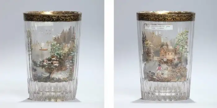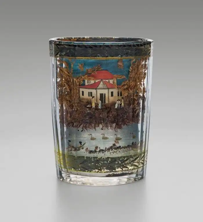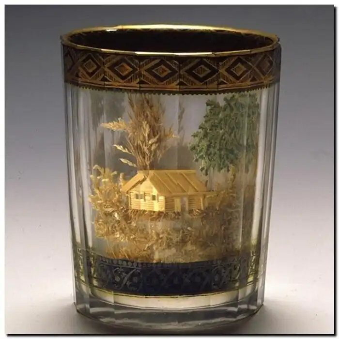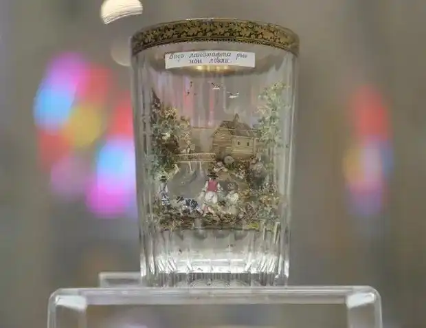 Считалось, что его стаканы - это тончайшая роспись внутри массы стекла. Но когда один из них случайно разбили, хранители провели экспертизу осколков и были поражены. Это была не роспись, а композиция, созданная из самых разных природных материалов. Фигурки был расписаны краской, а домики, деревья, трава были сделаны из настоящей травы, соломы, щепок и мха.
