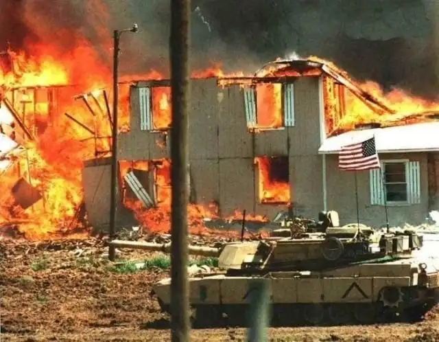 Танк Абрамс на фоне горящего ранчо после осады Уэйко. Техас, 1993 год.