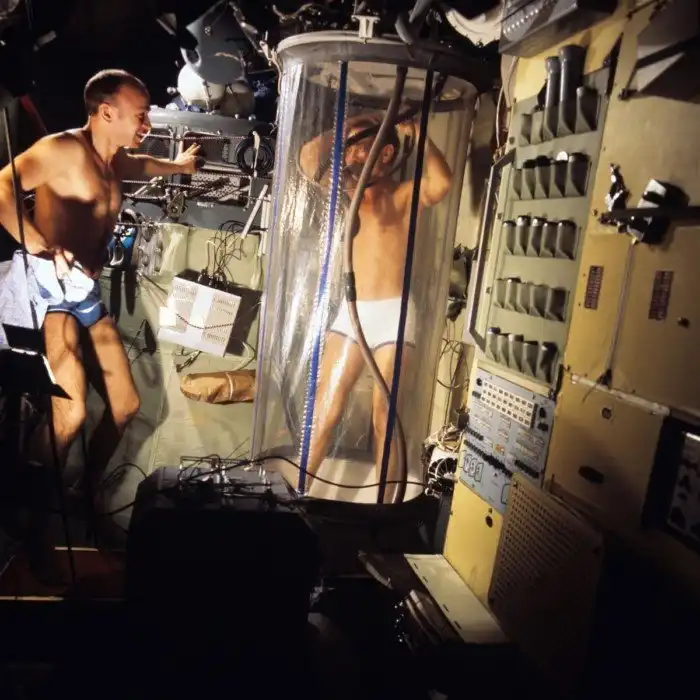 5. Космонавты Анатолий Березовой и Валентин Лебедев принимают душ на борту орбитальной станции Салют–7, 1982 год