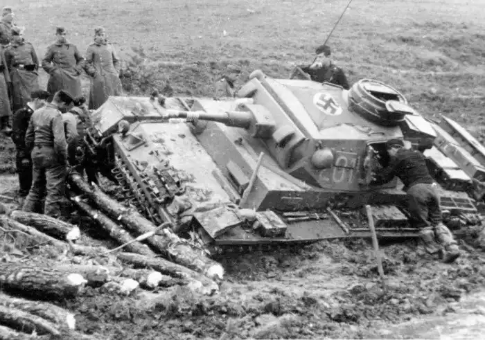 12. Танк Т-III, застрявший на одной из подмосковных дорог. Октябрь 1941 года