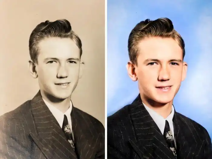 На выручку приходят новые технологии: на Reddit есть целая ветка обсуждений, где любой желающий может попросить помощи с раскрашиванием семейных фото. Например, такой портрет станет необычным подарком родственнику, а некоторые просто мечтают увидеть, как же выглядел их дедушка. Достаточно выложить старую чёрно-белую фотографию, а через некоторое время в комментариях обязательно появится человек, готовый её раскрасить. И вот, что получается!