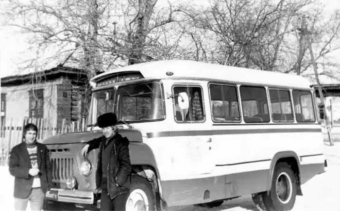 36. Два стильных парня на фоне популярного в СССР автобуса среднего класса КАвЗ-685.