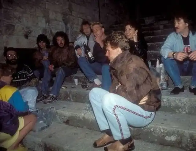 Маргулис, Газманов, Макаревич, Кельми, Демидов и другие выпивают на лестнице во время круиза "Мисс Пресса СССР", о.Родос, Греция, 1991 год